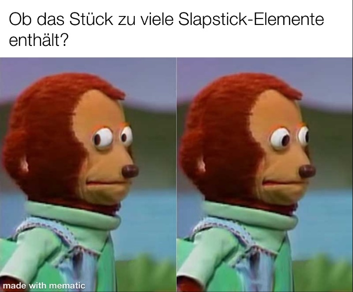 Innerhalb der großen Vielzahl an Memes, welche die Teilnehmer:innen unseres Meme-Makers-Day präsentierten – uns lagen am Ende rund 80 Memes zu vier Inszenierungen vor –, lassen sich Strukturen erkennen, die verschiedene Aspekte einer Theaterkritik aufgreifen. Das Material wird Grundlage einer umfassenden wissenschaftlichen Auswertung sein. Um aber bereits jetzt einen ersten Einblick in unser Vorhaben zu geben, haben wir uns für diesen Text auf eine kleine Auswahl an Memes zu einer der vier Inszenierungen konzentriert.